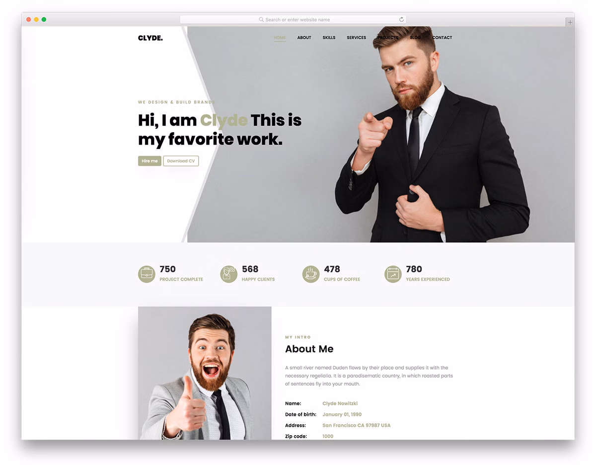 Build a striking online presence with the one page portfolio website template, Clyde. This remarkable and eye-catching web design will help you capture potential clients’ attention much easier. Thanks to the single-page structure, everyone can learn all about you in a mere few scrolls – no need to jump from page to page anymore. Also, the sticky navigation helps make every visitor to the desired section in just a click. Clyde also works on all devices and web browsers without a hitch for a smooth performance.