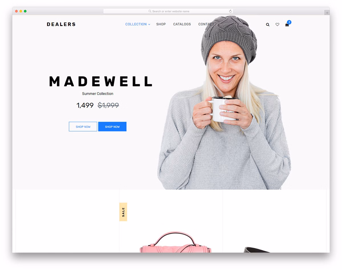 Above the fold, Dealers features a full-screen image background with text and call-to-action buttons. You will also find a multi-level drop-down menu which helps find products quicker. Other amenities of Dealers are hover effects, product slider, newsletter subscription widget and a working contact form. No doubt, your fashion eCommerce website will entice everyone to shop with this free template.