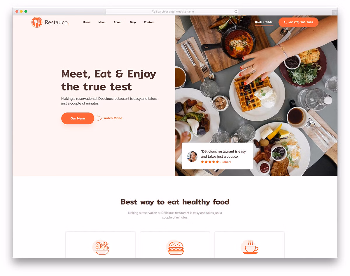 Moreover, Restauco’s layout is fluid, so your restaurant website will work on all modern devices and web browsers butter smoothly. Other features include a floating menu, carousels, back to top button, book a table form, reviews and Instagram-ready feed. You can also start a blog, share your location on Google Maps and let everyone get in touch with you via the functional contact form. Restauco is here to make a difference in the restaurant business.