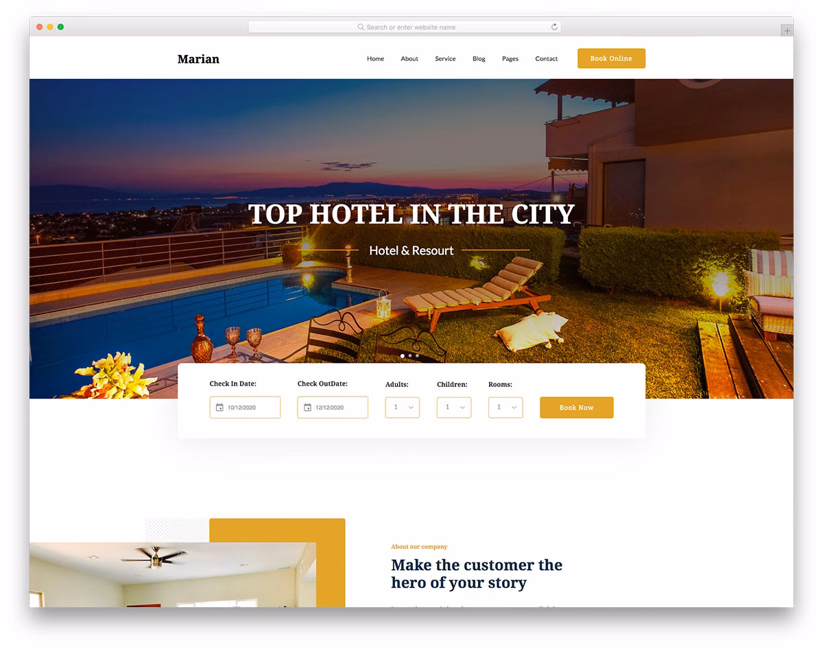 With Marian, a free modern hotel website template, you can create a striking online presence for your accommodation business. Instead of making things happen from zero, Marian is a solution that will help you on your journey to success. The design is very appealing to the eye, clean and sophisticated, making sure to create a pleasant experience for all your visitors and returning customers. Not to mention, Marian works seamlessly on all popular devices, web browsers and retina screens.
