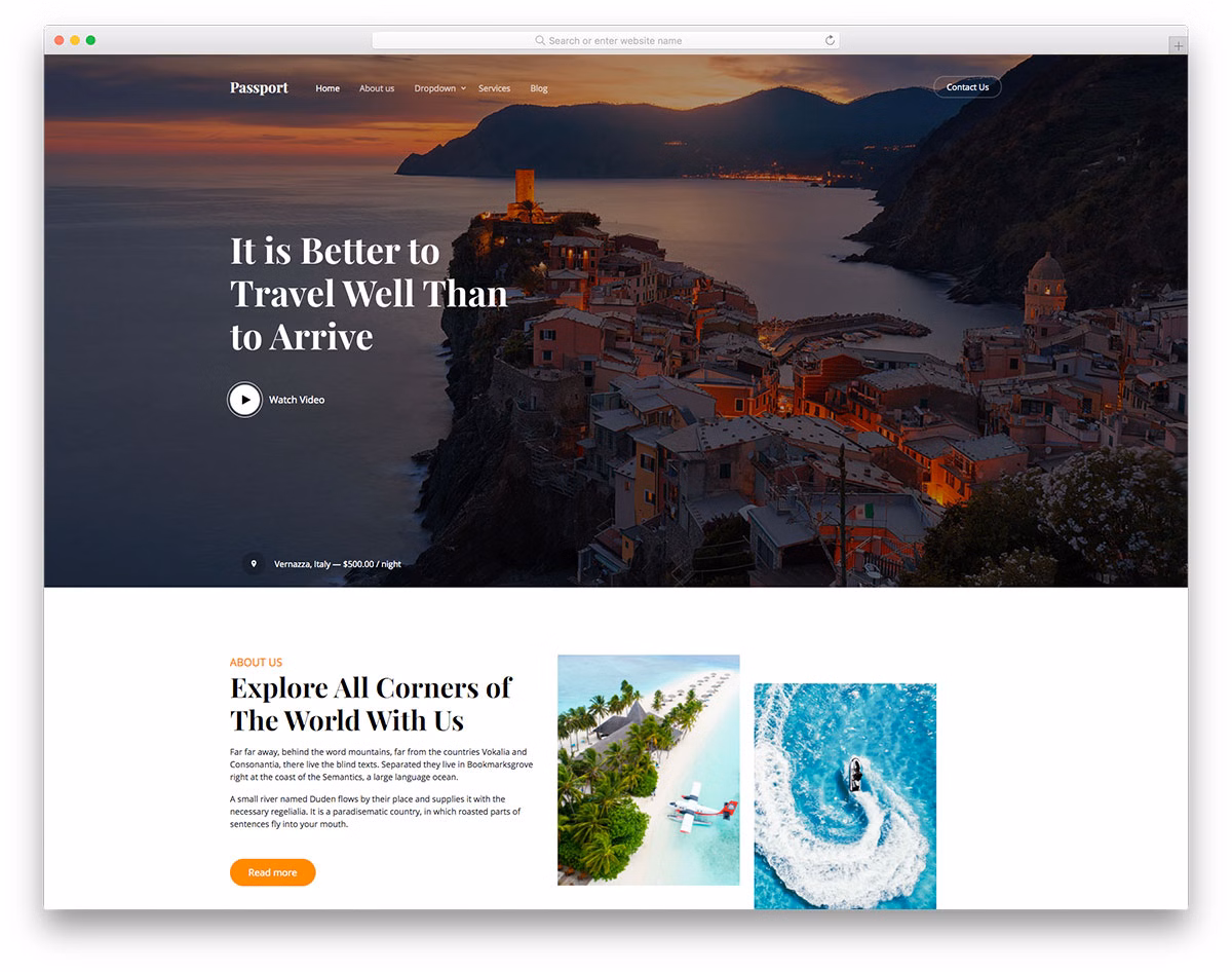 Moreover, you are also welcome to perform additional tweaks and improvements if necessary. After all, there is no need to stick to the default look to a tee; you can brand and personalize Passport, too. A few extras are a drop-down menu, functional contact form and video support, to name a few. Enjoy building a striking and business-driven travel agency website now with Passport.